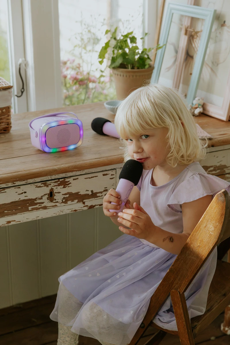 Karaoke set přichází se dvěma mikrofony a jasnými LED světly s 5 světelnými režimy, které vytvoří skutečnou párty atmosféru. Díky čtyřem zábavným hlasovým efektům se zaručí nekonečná zábava pro všechny malé talenty.