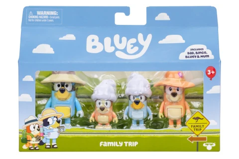 Sada čtyř plastových figurek rodiny Bluey připravených na společný výlet. Balení obsahuje figurky tatínka Bandita, maminky Chilli, Bluey a Binga v tematickém oblečení s fotoaparátem a dalekohledem. Figurky mají pohyblivé ruce a tělo pro snadné polohování a jsou vysoké cca 5–8 cm. Sada je kompatibilní s ostatními herními sety a doplňky z kolekce Bluey.