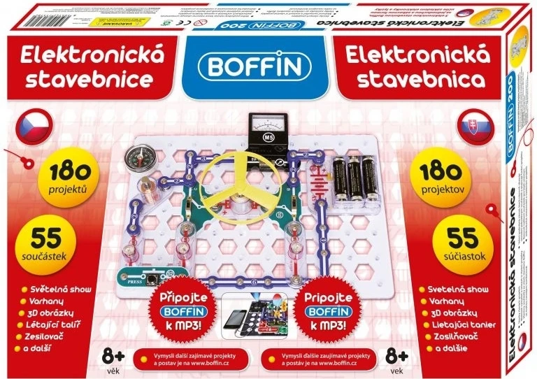 Elektronická stavebnice Boffin 200 obsahuje 55 součástek, z nichž lze postavit tyto projekty: Světelná show Varhany 3D obrázky Létající talíř Zesilovač a další, celkem 180 projektů, které jsou podrobně popsány v přiloženém manuálu.