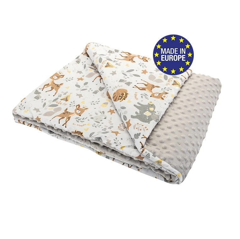 Materiál je šetrný k dětské pokožce, velmi příjemný na dotek. Deka má v životě miminka mnoho uplatnění : jako hrací deka, deka do kočárku či do postýlky. Deka je díky výplní vhodná po celý rok, jak do chladného léta, tak do podzimu. Deka chrání miminko před větrem a nepříznivým počasím.