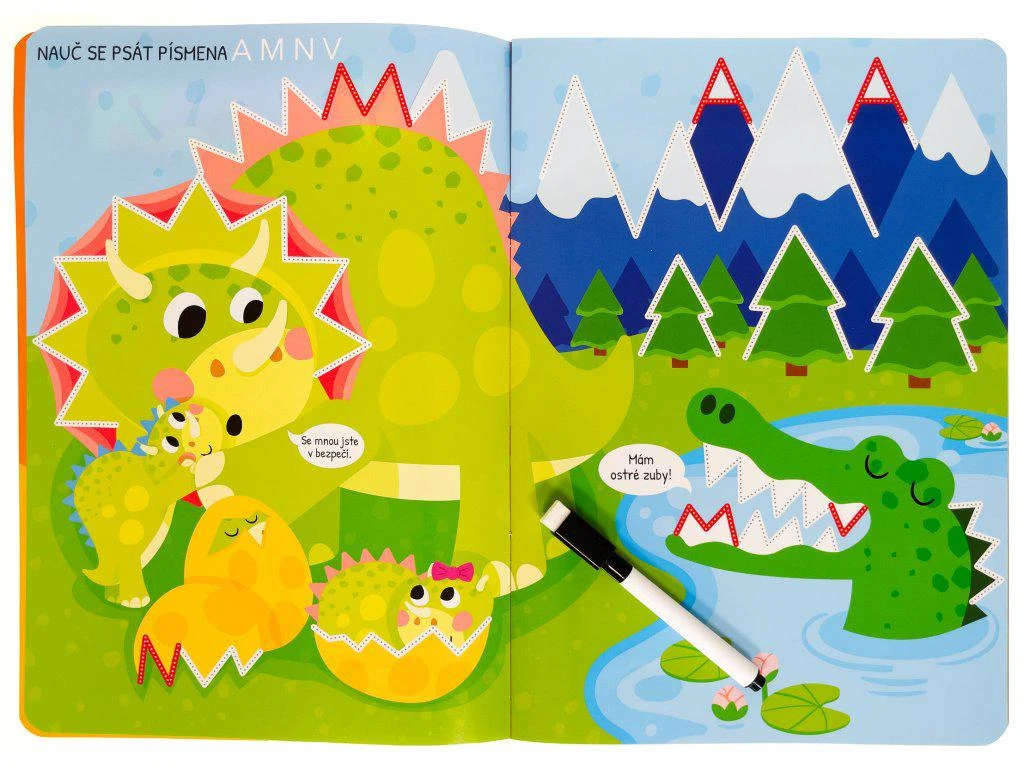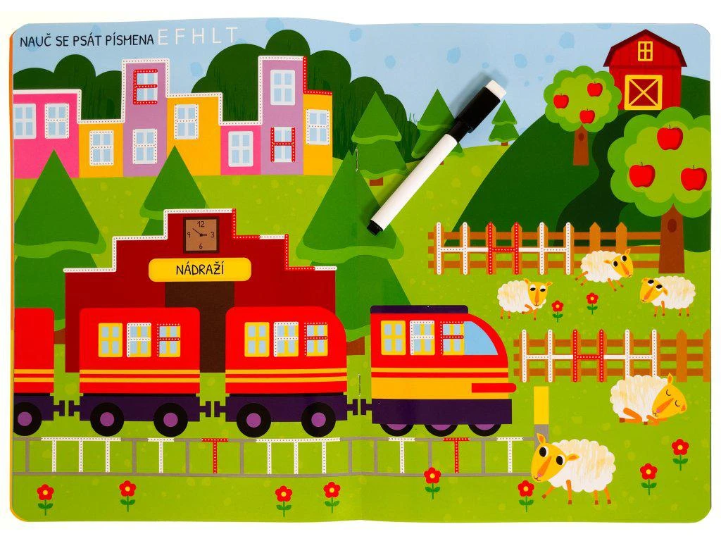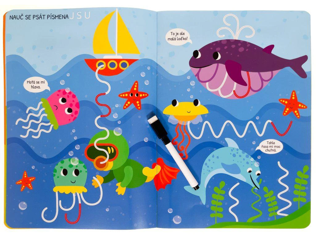 Obtahuj čáry, piš písmena, pak vše smaž a začni znovu. Hravé obrázky vybízejí k obtahování rovných, klikatých i zakřivených čar, které v sobě nápadně ukrývají i písmena. Sešit s pevnými lesklými stránkami je vhodný pro děti, které se učí první tahy i detailnější linky a první písmena. Nemusí se bát přetahovat a dělat chyby. Když se něco nepovede, jednoduše to smažou a díky stíratelnému fixu, který je součástí sešitu, se můžou k úkolům vracet znovu a znovu.