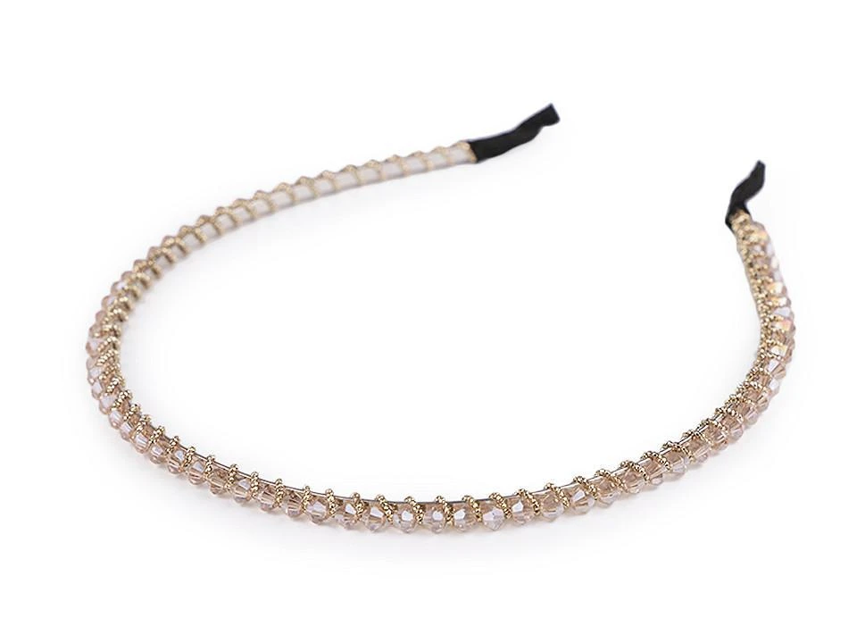 Na kovovém základu širokém 3 mm jsou lurexovým provázkem pevně připevněné skleněné korálky s půvabným leskem. Díky lurexu se čelenka jemně třpytí.