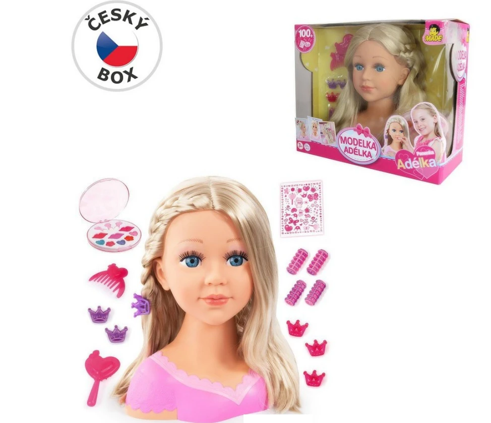 Česací hlava s české kolekce Adélka je vhodným dárkem pro každou holčičku, která se ráda zkrášluje. Vše si může vyzkoušet na své nové kamarádce. Balení obsahuje 13 ks příslušenství a česací hlavu.