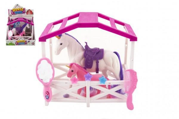 Česací jednorožec se sedlem s hříbětem, doplňky a ohradou