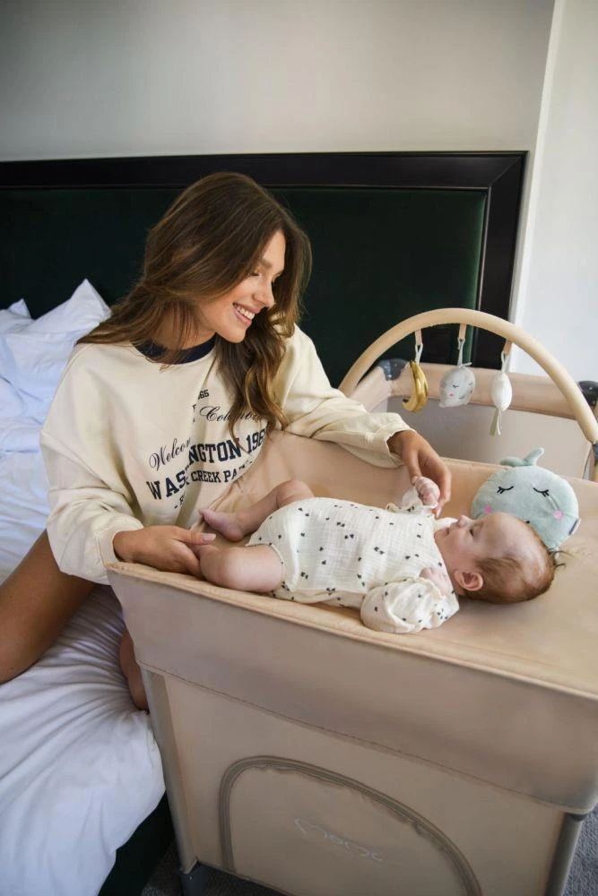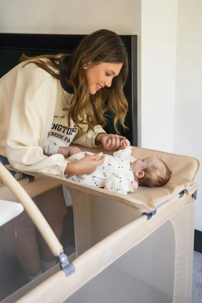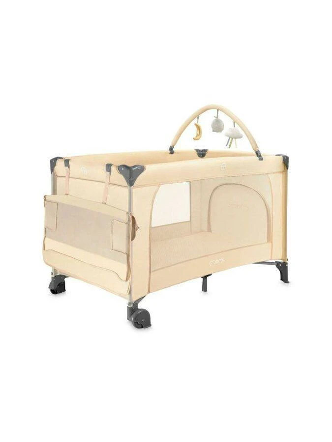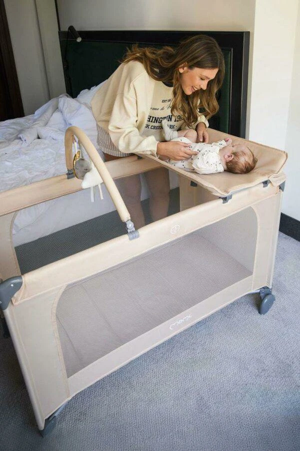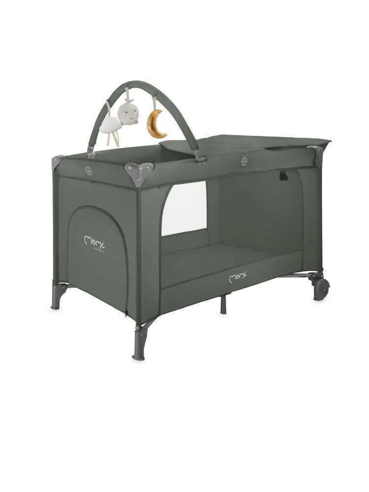 Součástí postýlky je matrace, hrazdička s hračkami a přebalovací pult.
