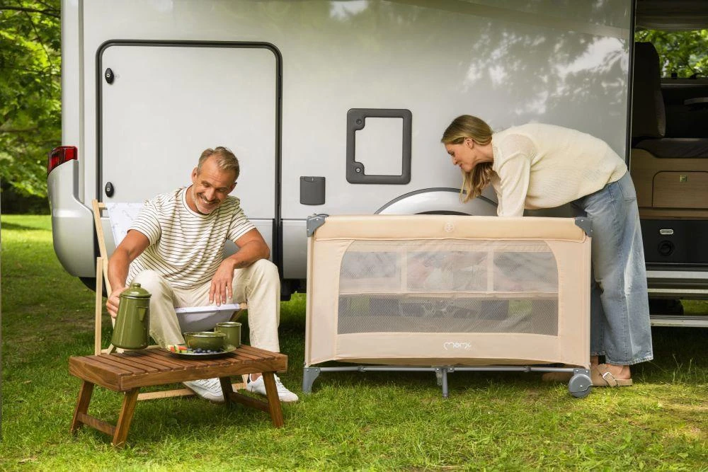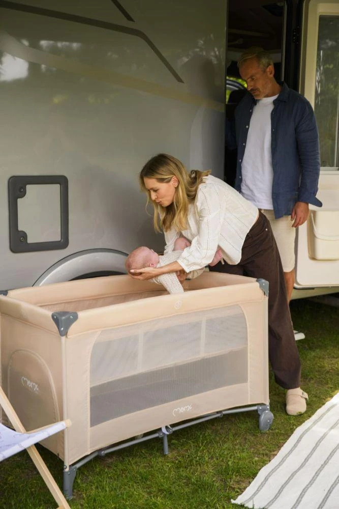Díky speciálnímu mechanismu lze naši cestovní postýlku MoMi BELOVE PLUS snadno a rychle rozložit.