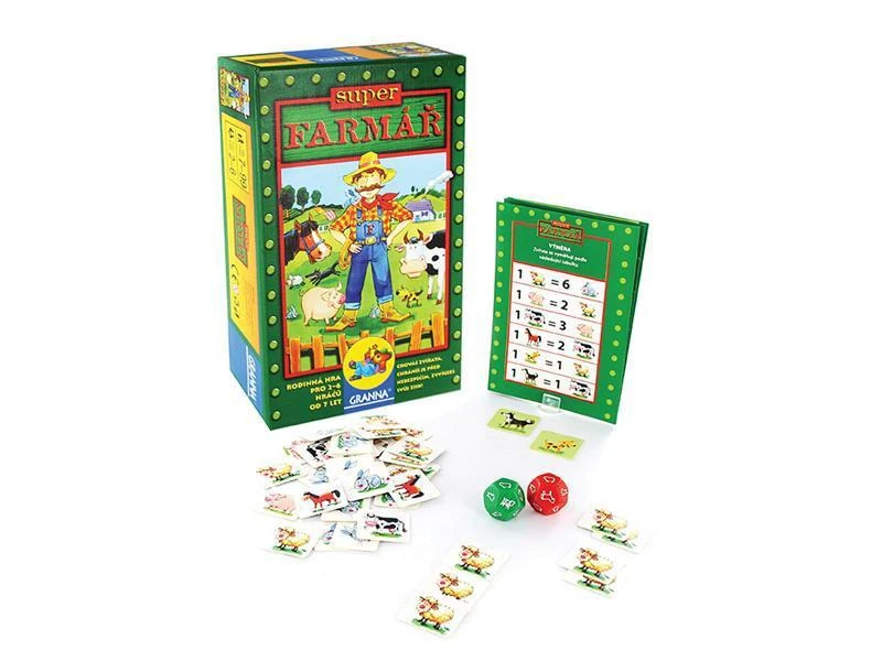 Všechny hráčovy plány však mohou být zmařeny, nebude-li dost ostražitý! Kolem stáda se totiž potulují liška a vlk a hráčova zvířata se mohou stát jejich snadnou kořistí. Pravidla hry, která se opírají o zásady matematiky a logiky, nutí hráče počítat, předvídat, plánovat a kalkulovat s riziky. Tato jedinečná hra tak učí děti i rodiče strategickému myšlení. Hru Cestovní Superfarmář nabízíme v české i slovenské verzi.