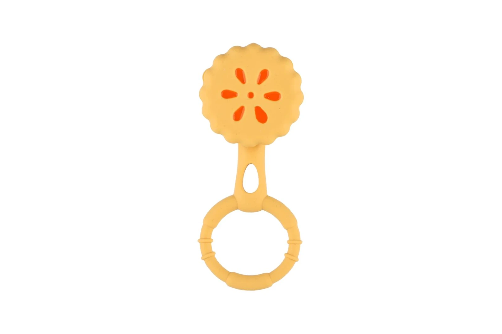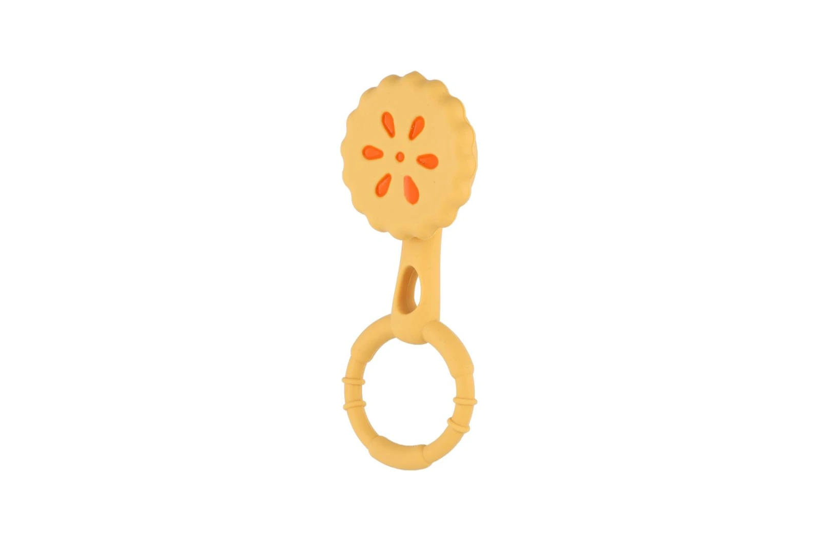 Hravý design koláčku zaujme na první pohled a díky praktickému kroužku se snadno drží i v malých dětských ručičkách. Měkký silikonový materiál je příjemný na dotek a vhodný také při prořezávání prvních zoubků. Lehká konstrukce podporuje samostatné uchopení a rozvoj jemné motoriky. Jemné chrastění stimuluje sluchové vnímání a přirozenou zvědavost dítěte.