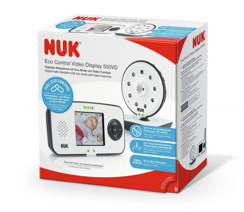 - Digitální technologie FHSS dětské chůvičky NUK Eco Control Video Display 550VD poskytuje spolehlivý, jasný a bezporuchový přenos signálu, abyste nepřeslechli ani ten nejtišší zvuk. Až se 32 vlastními kanály zabezpečenými proti hackerství a s automatickým vyhledáváním kanálů je zajištěno dostatečné zabezpečení. Opravdu jste to jen vy, kdo může slyšet, když je váš snílek neklidný nebo pláče. Zůstaňte flexibilní s novou digitální chůvičkou od společnosti NUK: díky dosahu až 250 m a bezdrátovému provozu přenosné rodičovské jednotky můžete plnit vaše každodenní domácí povinnosti, vychutnat si četbu knihy nebo prostě odpočívat. Díky časovači krmení jste vždy včas připraveni na dobu krmení vašeho miminka. Nabíjecí LiPo baterie mají maximální výdrž až 8 hodin. Výdrž baterie se může prodloužit, pokud je snížená citlivost a hlasitost a displej je vypnutý. Dětskou jednotku je v případě potřeby možné upevnit na zeď.