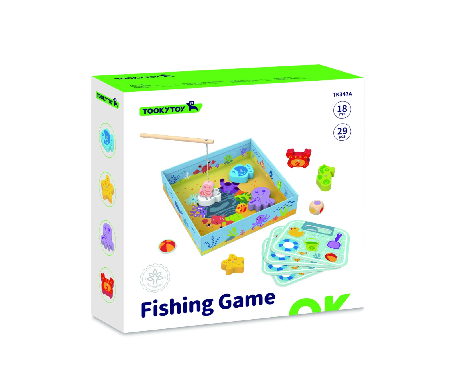 - Obsahuje: 1 rybářský prut s magnetem, 1 kostku, 1 podložku představující moře, 6 dřevěných mořských tvorů a 4 kartonové hrací karty, které se používají ke sbírání bodů během hry.