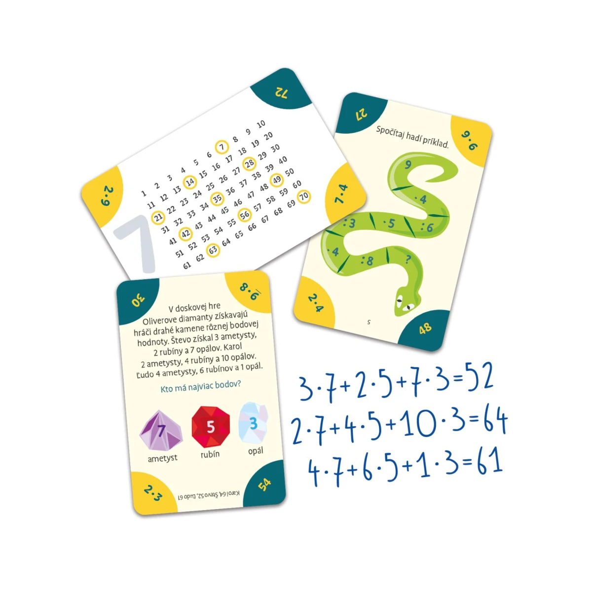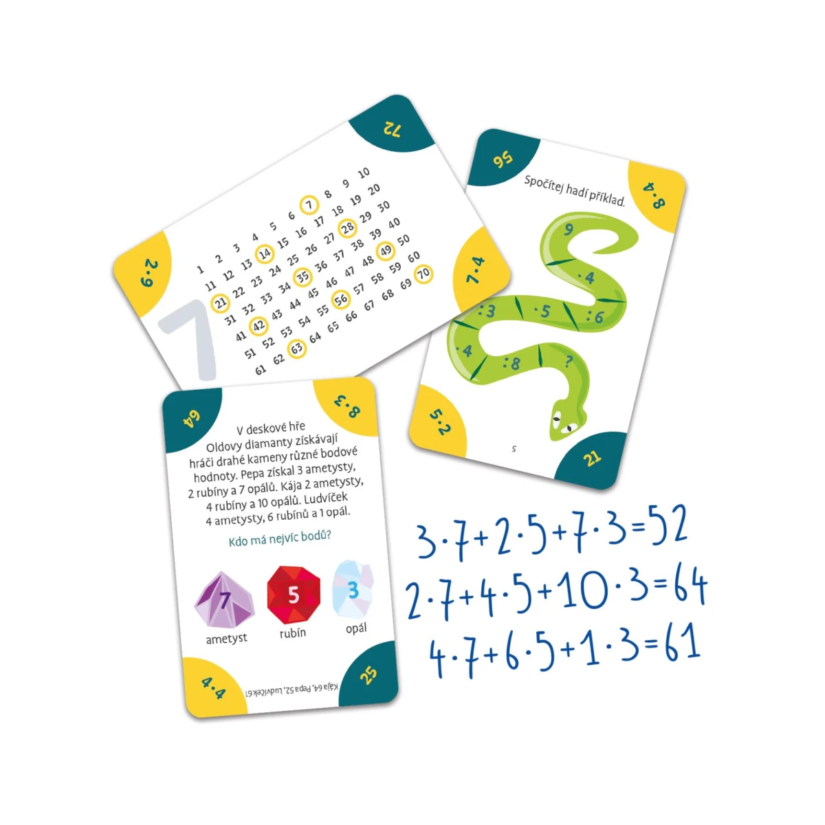 Balení obsahuje kartičky s příklady násobilky a návod ke hře. Vše uloženo v praktické krabičce.