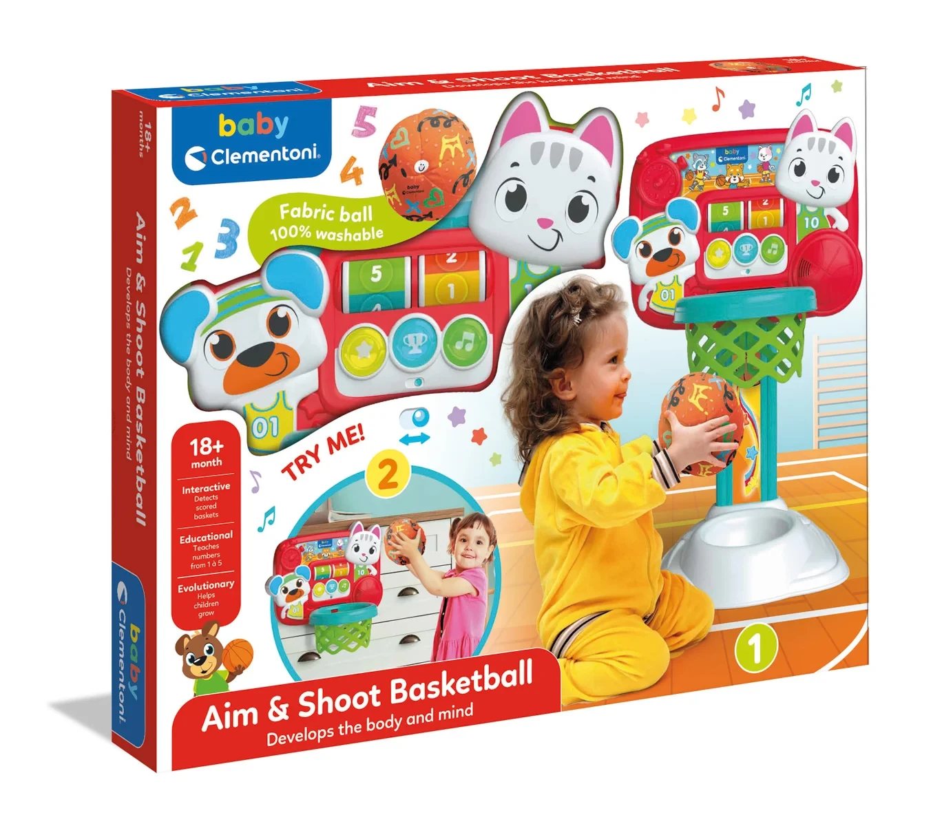 Výškově nastavitelná základna a odnímatelná zadní deska k zavěšení na zeď v pokoji, až děti povyrostou. Obruč zaznamenává skóre a učí děti čísla a první slova. Tato hra stimuluje motoriku, manuální schopnosti a koordinaci.