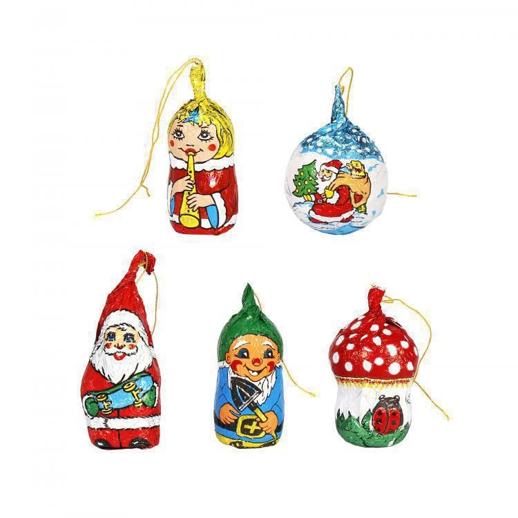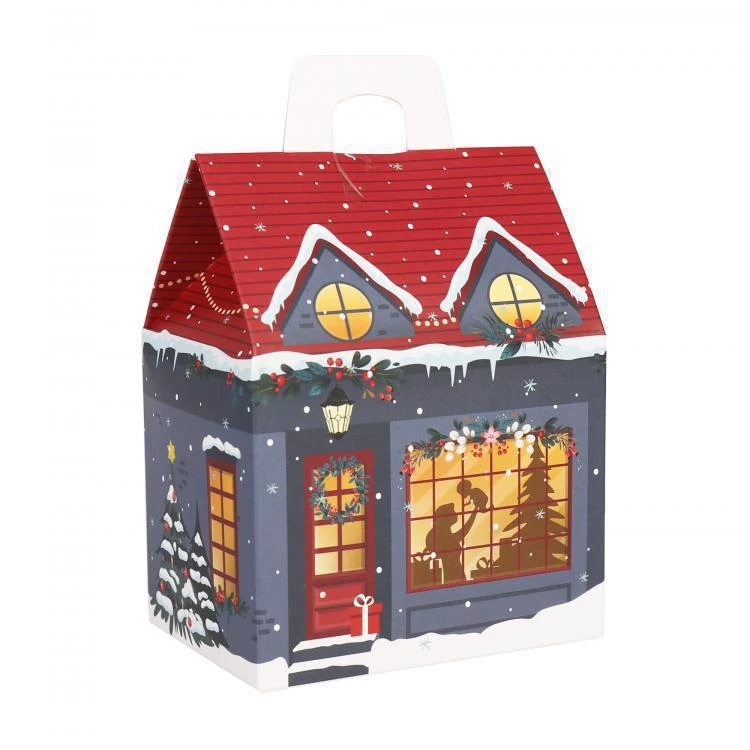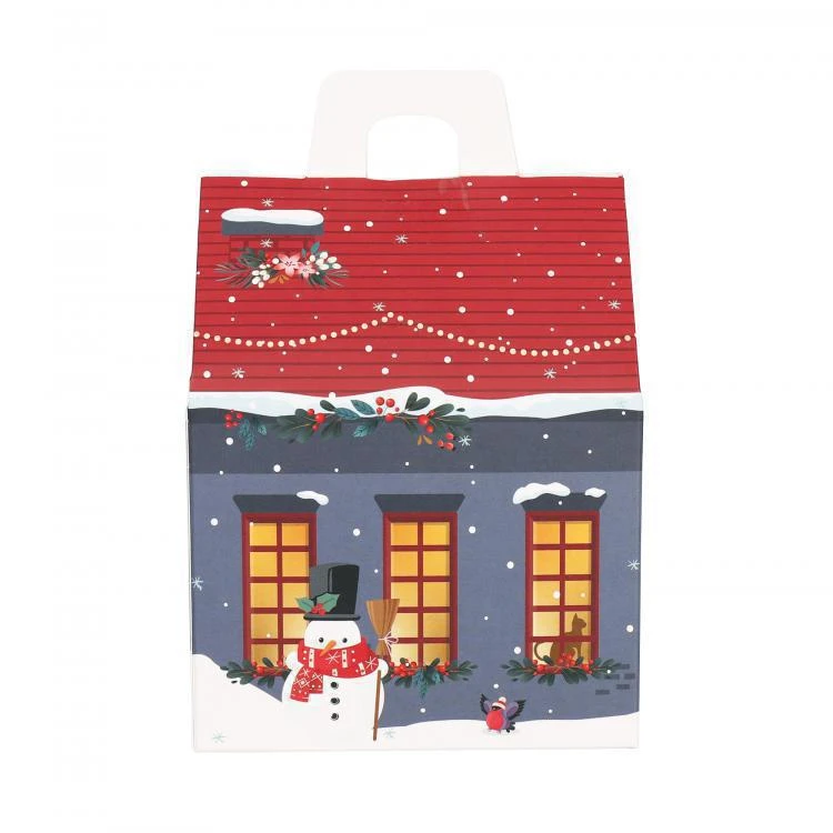 Papírový vánoční domeček plný figurek z mléčné čokolády.