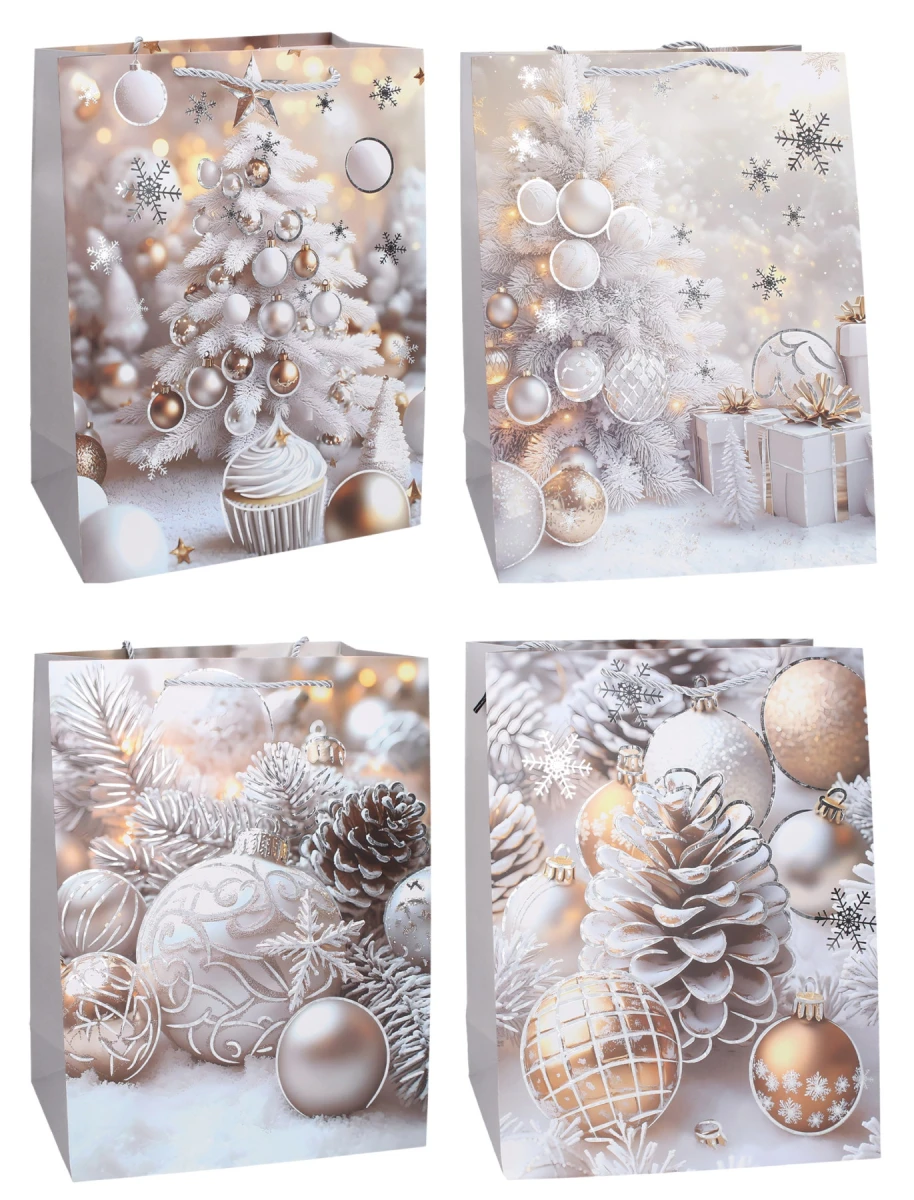 Vánoční dárková taška o rozměrech 26×32×10 cm je vhodná pro středně velké dárky. Je vyrobena z kvalitního papíru s elegantními vánočními motivy, které dodají každému dárku slavnostní a vkusný vzhled. Díky pevnému materiálu taška dobře drží tvar a usnadňuje balení i přenášení dárků.