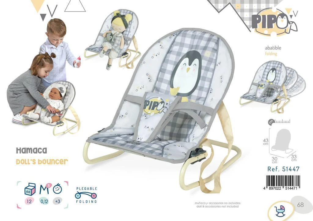 DeCuevas 51447 Polohovací lehátko pro panenky PIPO 2022, ze stejnojmenné kolekce, která je novinkou roku 2022, potěší jistě každou malou slečnu, která ráda cestuje se svou panenkou v autě. Lehátko je vhodné pro panenky do velikosti max 48 cm. Kolekce nabízí krom různých druhů kočárků a nábytku pro panenky i další doplňky pro budoucí hospodyňky. Charakteristická je pro tuto kolekci šedobílá kostka v kombinaci s jednobarevnými šedivými a bílými drobně vzorovanými částmi a doplňky v jemně žluté barvě a již zmíněným tučňákem PIPO. Nádherný španělský design, precizní zpracování. Velmi snadná manipulace během samotné hry. Materiál: kov, plast, textil. Baleno v designovém igelitovém obalu v barvách kolekce. Doporučený věk od 3 let.