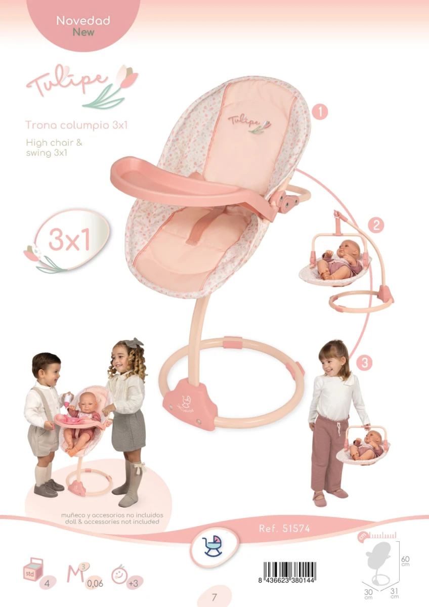 Multifunkční jídelní židlička a houpačka pro panenky 3 v 1 Tulipe DeCuevas