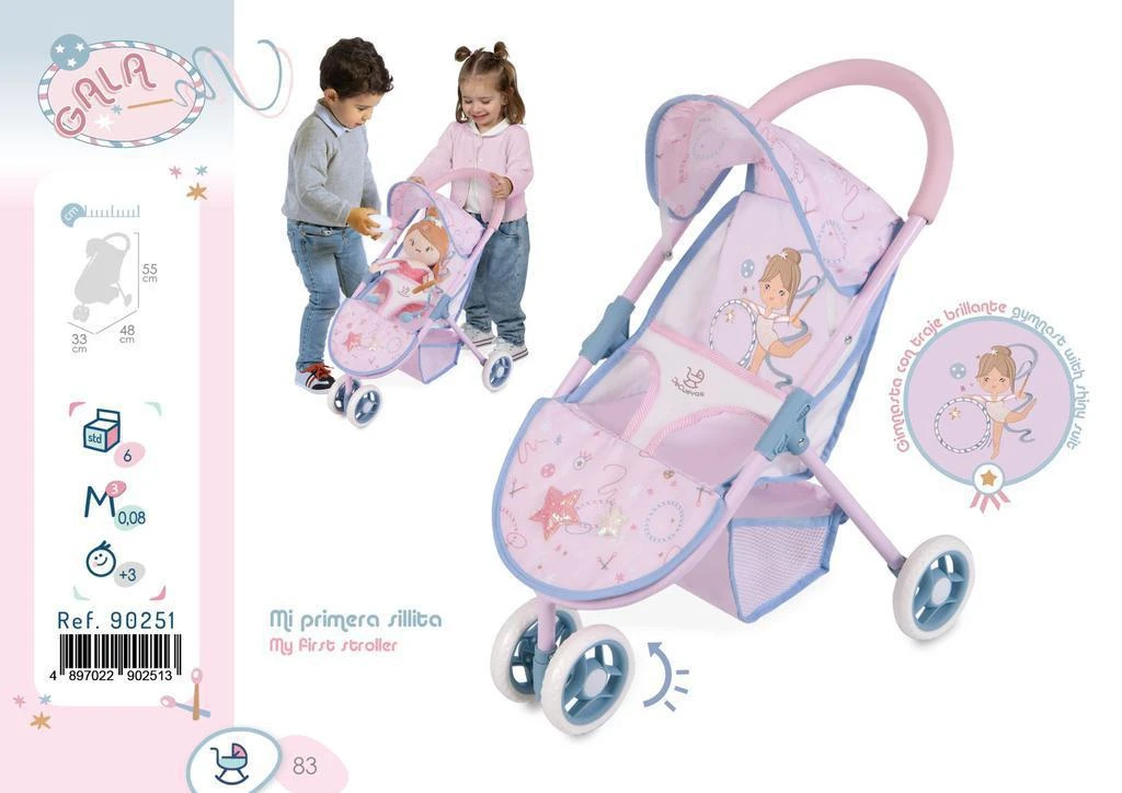 DeCuevas 90251 Sportovní kočárek pro panenky tříkolový GALA 2023 - 55 cm, ze stejnojmenné kolekce, která je novinkou roku 2023, je díky nízké rukojeti a váze spíš vhodný pro malé a menší slečny. Charakteristická pro tuto kolekci je malá gymnastka, zachycena v baletně sportovní kreaci. Celou růžovobílou kolekci s drobným potiskem sportovních prvků doplňuje modrá barva a danou tematiku navíc podtrhují sportovně laděné tašky na kočárkách. Nádherný španělský design, precizní zpracování. Skládací model, velmi snadná manipulace během samotné hry. Materiál: kov, plast, textil. Baleno v krabici v barvách kolekce. Doporučený věk od 3 let.
