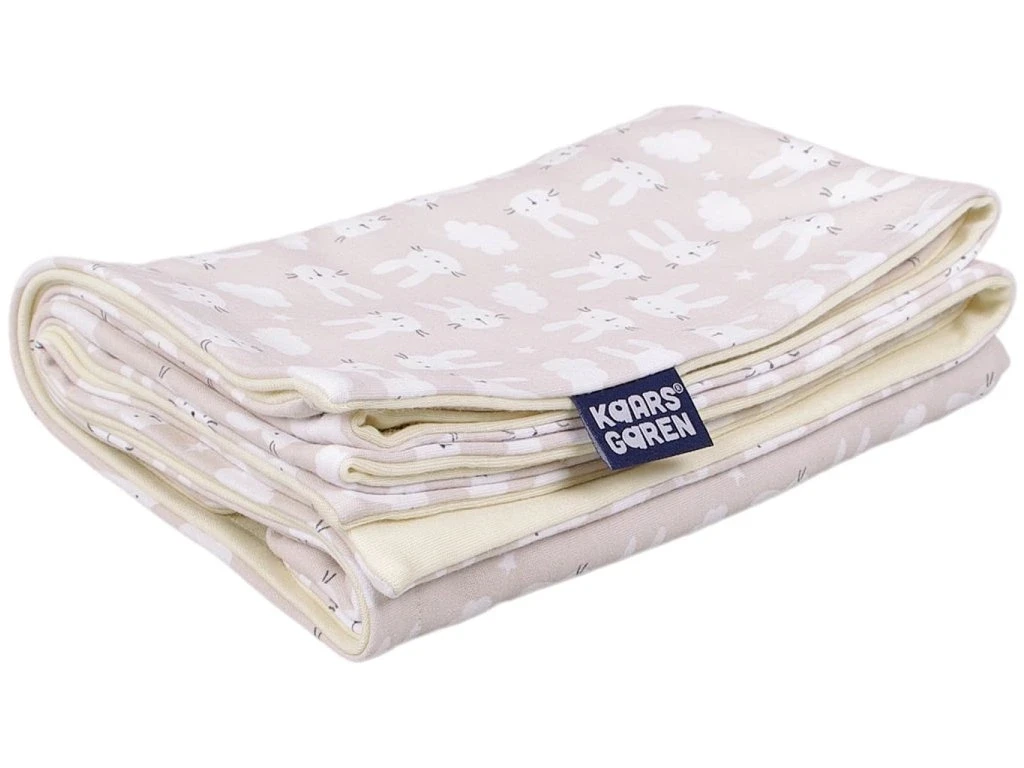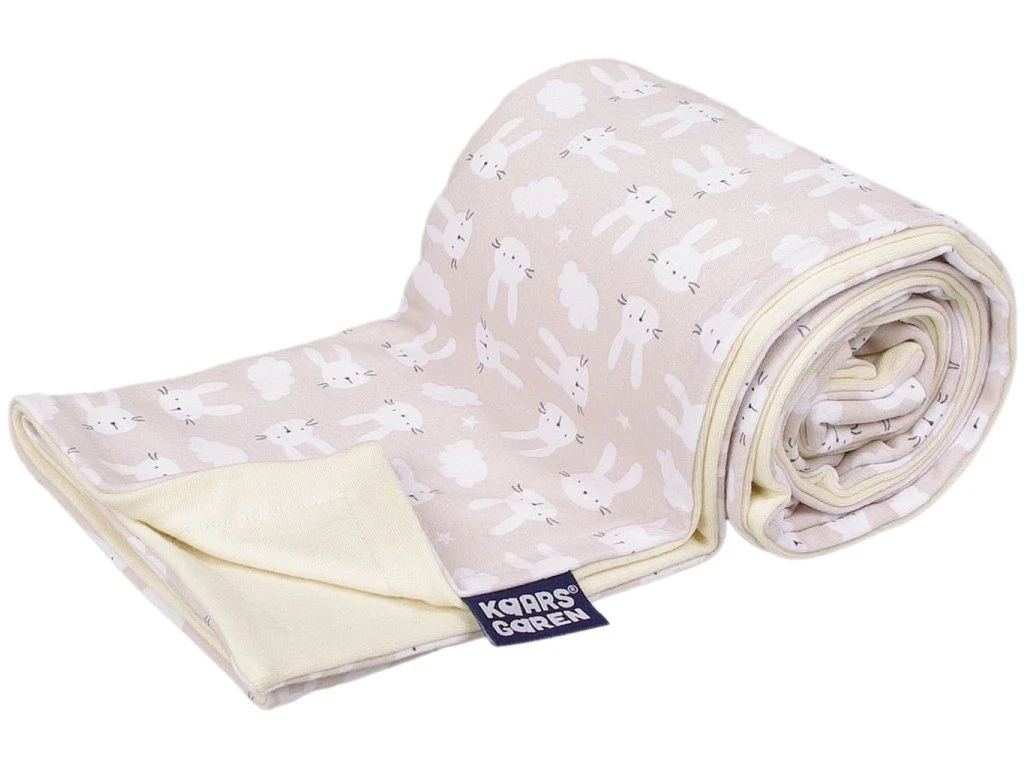 Oboustranná dětská deka z bavlny a merino vlny poskytuje miminku příjemné teplo, prodyšnost a přirozenou regulaci teploty po celý rok. Jemný motiv béžových zajíčků působí klidně a snadno se sladí s ostatní dětskou výbavičkou.