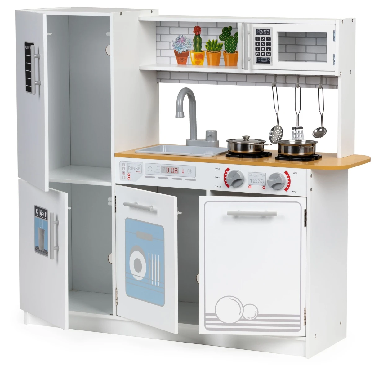 Pro budoucí MasterChefy Všechny děti rády napodobují dospělé. Díky této kuchyňce se vaše dítě snadno vžije do role kuchaře či kuchařky a užije si realistickou hru na vaření. Malý šéfkuchař má k dispozici hořáky s otočnými knoflíky pro nastavení správné „teploty“ při vaření. Pod pracovní deskou se nachází trouba a myčka na nádobí. V horní části je umístěná otevírací mikrovlnka a další police na kuchyňské pomůcky. Nechybí ani prostorná lednice s mrazákem a místo pro poznámky k nákupnímu seznamu.