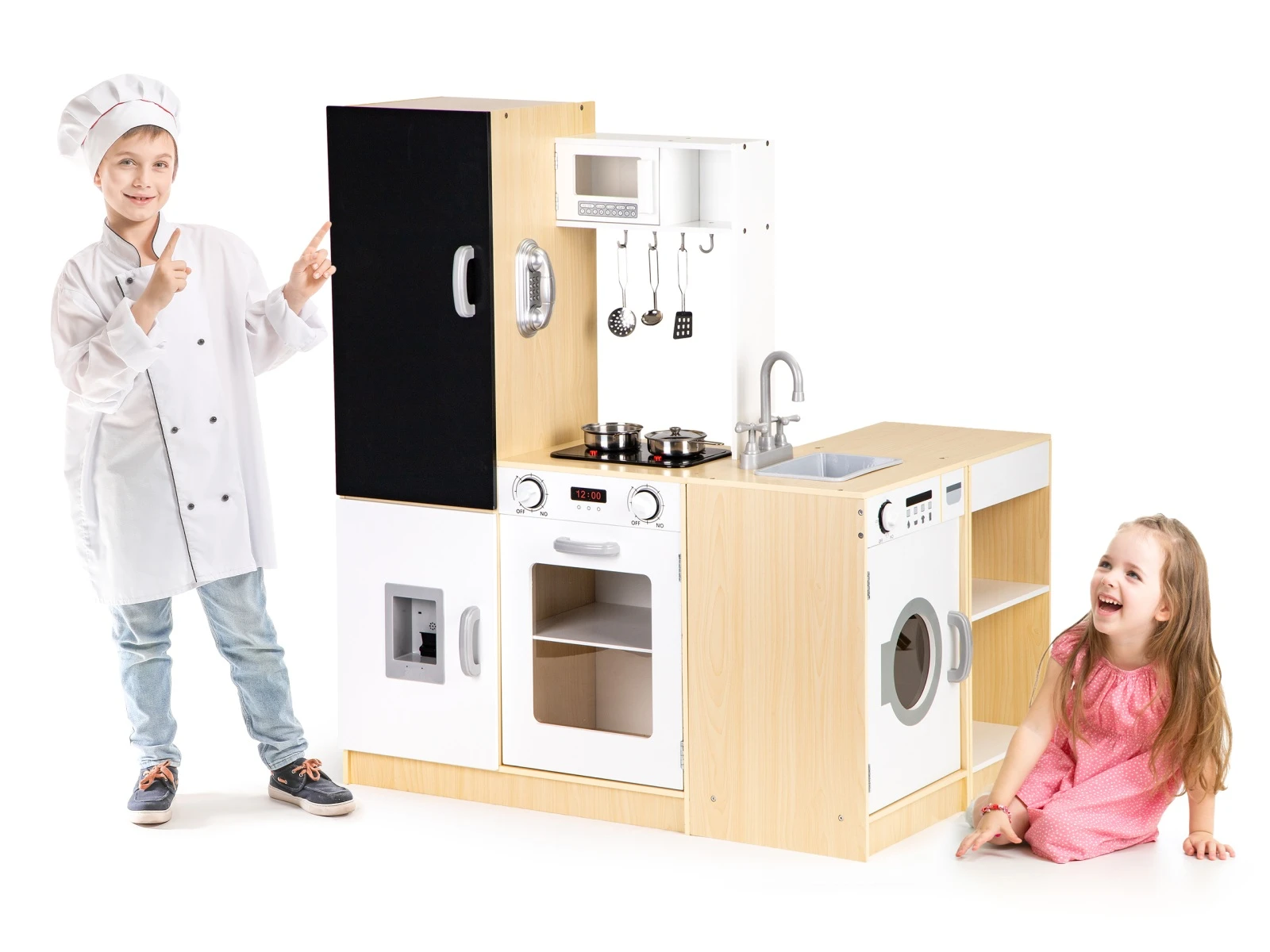 Dětská dřevěná kuchyňka s oddělenými segmenty, tabulí a LED osvětlením XXL