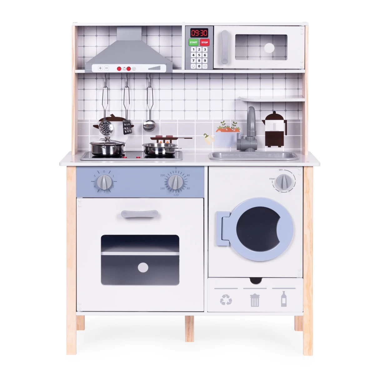 Kuchyňka má závěsnou digestoř, která osvětluje varnou desku a vydává zvuk chodu. Pračka umístěná vedle trouby zpestří hru praním oblečení. Skvělý krok, jak vést dítě k samostatnosti a zodpovědnosti za každodenní povinnosti. Malý kuchař může současně péct, vařit i ohřívat v mikrovlnce. Po dokončení vaření lze veškeré nádobí umýt v prostorném dřezu a uklidit pomůcky na svá místa. Všechny dvířka kuchyňky se otevírají, což přináší spoustu zábavy a zároveň učí udržovat pořádek. Nechybí ani promyšlené detaily jako háčky na kuchyňské náčiní, aby bylo vždy po ruce.