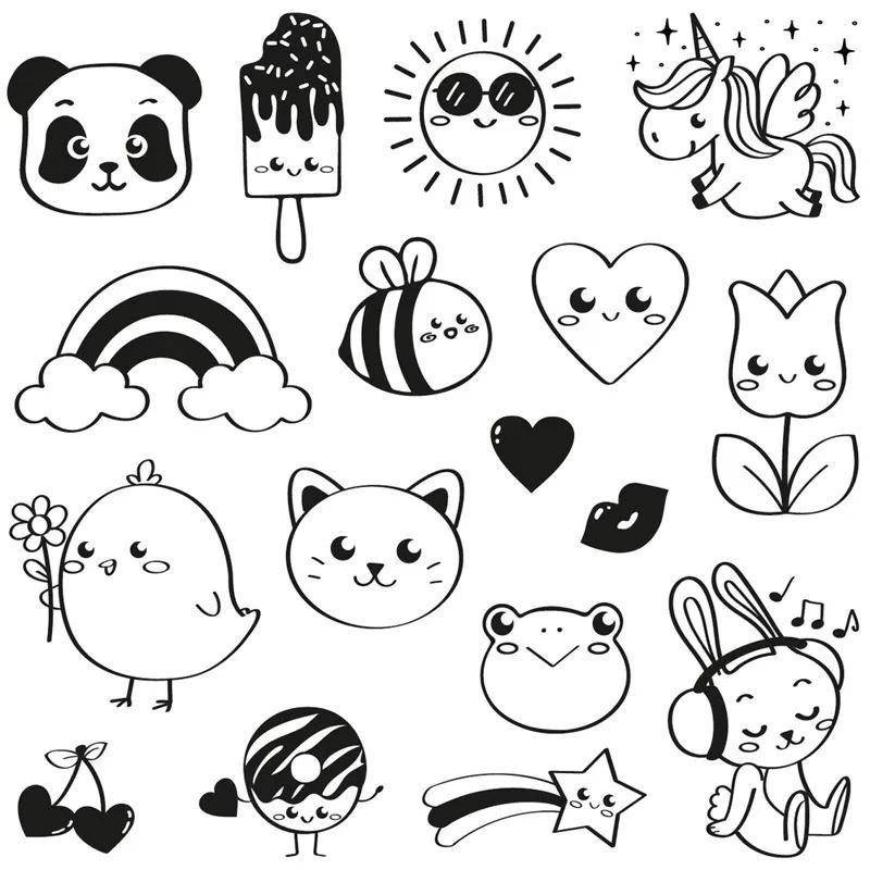 Balení obsahuje 17 razítek a černý razítkovací polštářek s černým inkoustem na papír. Razítka mají rozměry mezi cca 1,5 cm a 4,5 cm.