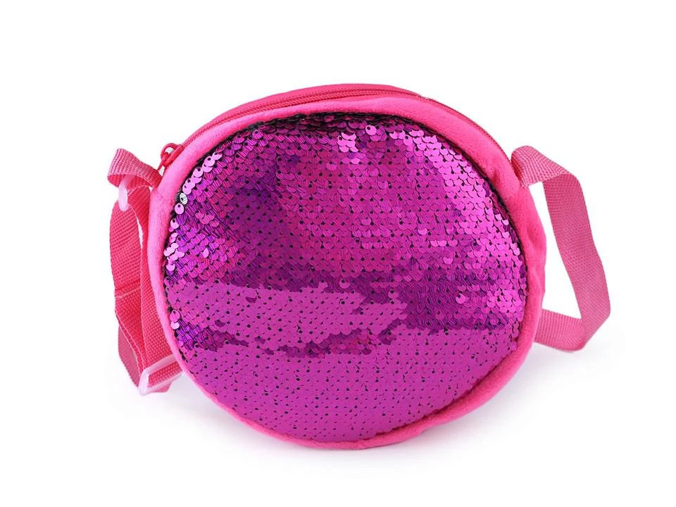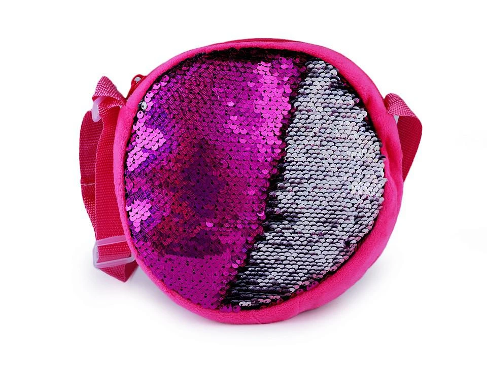 Kulatá kabelka s oboustrannými, otáčecími flitry nadchne všechny hravé slečny. I kabelka totiž může být hrou - důmyslně našité flitry umožňují měnit jejich barvu pouhým pohlazením, čímž dokáží změnit i samotný vzhled kabelky. Flitry jsou na přední straně, zbytek kabelky je z jemného, měkoučkého plyše. Zapíná se na zip, uvnitř je polyesterová podšívka. Kabelka má nastavitelný popruh.