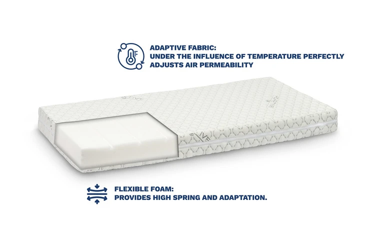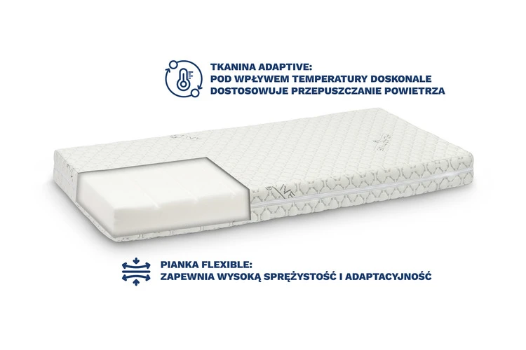 Vnitřní složení: polyuretanová pěna Flexible HR. Potah: tkanina Adaptive, snímatelný a pratelný. Matrace je vhodná do většiny klasických i cestovních dětských postýleka poskytuje klidný, pohodlný a bezpečný spánek. Použité materiály splňují požadavky normy OEKO-TEX® Standard 100 – Textilie hodné důvěry.