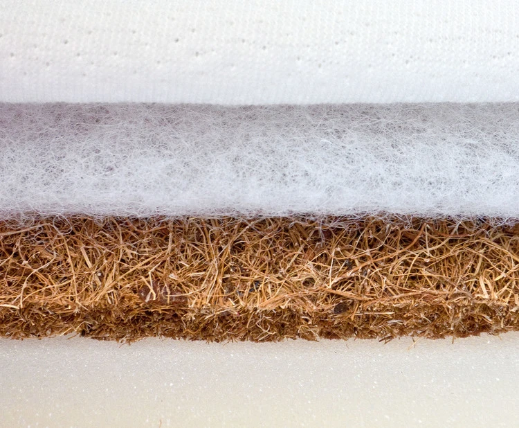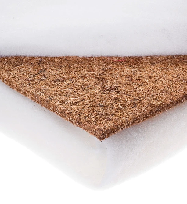Vnitřní složení: kokosová deska (1 cm) obalená netkanou textilií, polyuretanová pěna (6 cm).Výška matrace: cca 9 cm. Tvrdost: H3 (tvrdší strana s kokosem) / H1 (měkčí strana s pěnou).