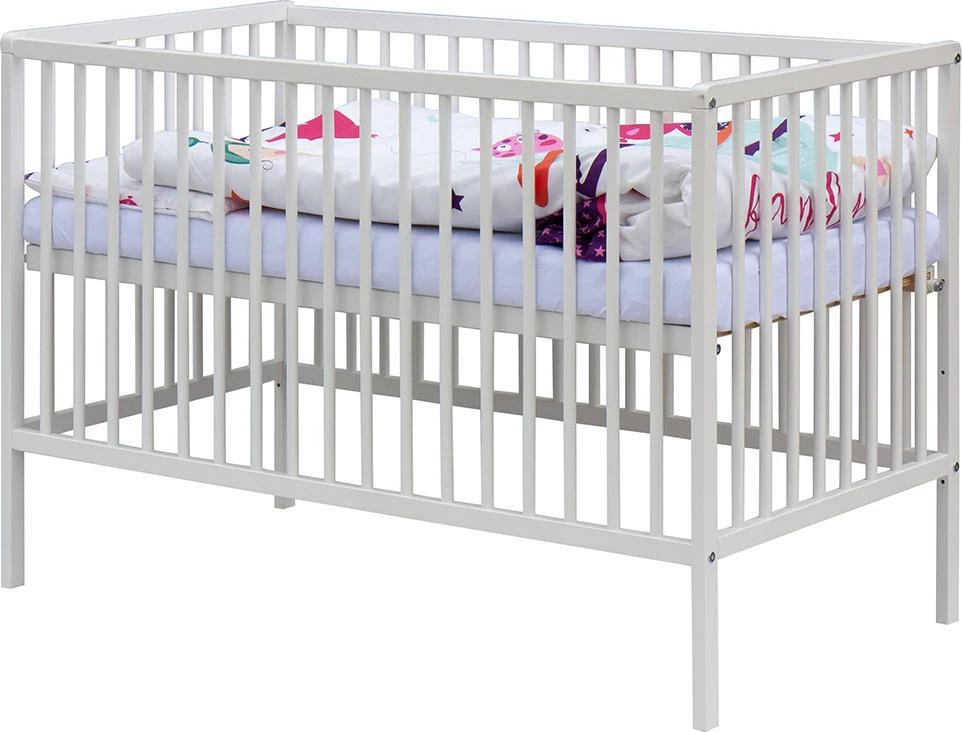 1. Dětská dřevěná postýlka 120x60 cm - bílá, masiv buk, 3 vyndavací příčky, 3 polohy roštu