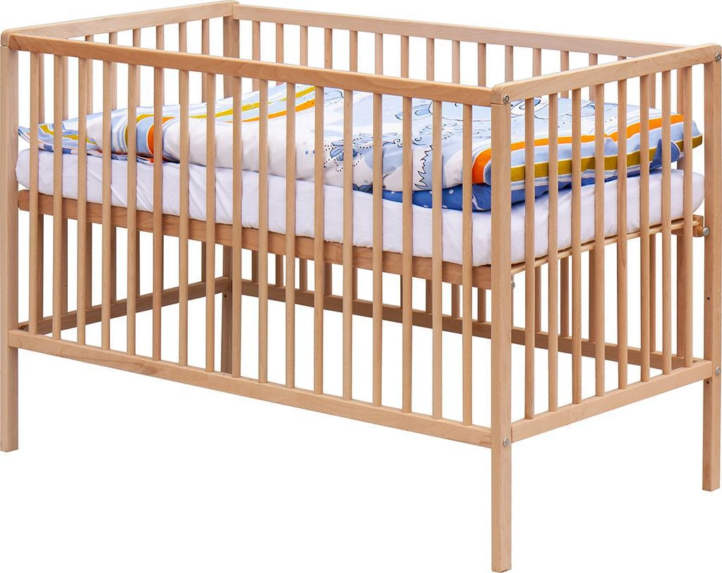 1. Dětská dřevěná postýlka 120 x 60 cm - přírodní, masiv borovice, 3 vyndavací příčky, 3 polohy roštu,