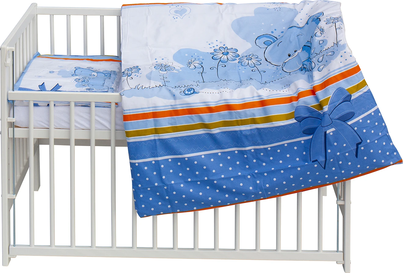 Základem kompletu je dřevěná postýlka o rozměru 120 × 60 cm, vyrobená z masivní borovice v bílé barvě. Postýlka je vybavena stahovacím bokem, který usnadňuje manipulaci s miminkem, a roštem nastavitelným do 6 poloh, díky čemuž se snadno přizpůsobí věku a vývoji dítěte.