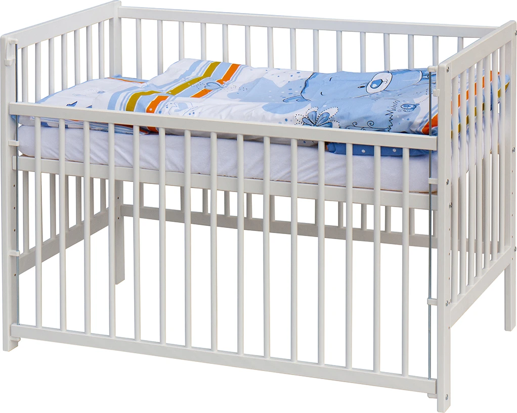 1. Dětská dřevěná postýlka 120 x 60 cm - bílá, masiv borovice, stahovací bok, 6 poloh roštu