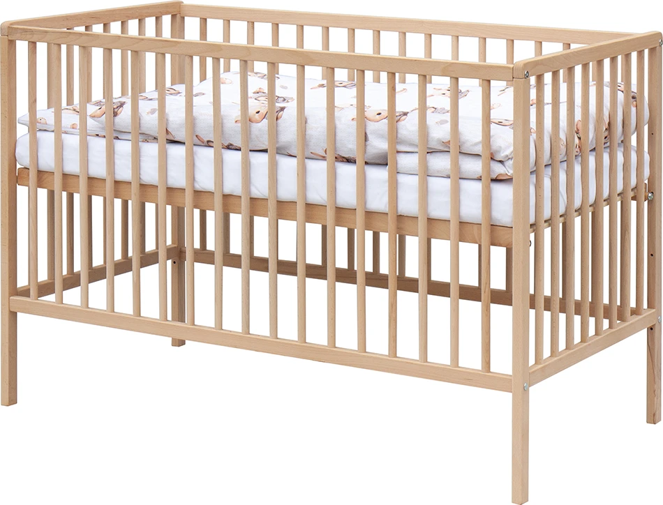1. Dětská dřevěná postýlka 120 x 60 cm - přírodní, masiv buk, 3 vyndavací příčky, 2 polohy roštu,