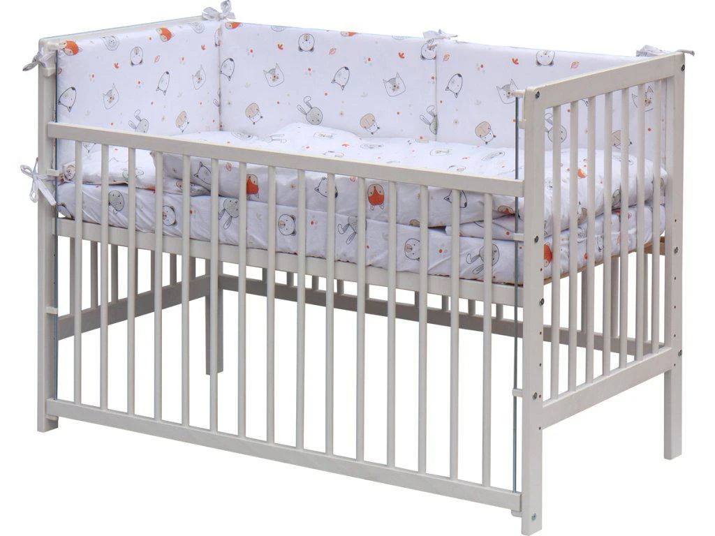 1. Dětská dřevěná postýlka 120 x 60 cm - bílá, masiv borovice, stahovací bok, 6 poloh roštu