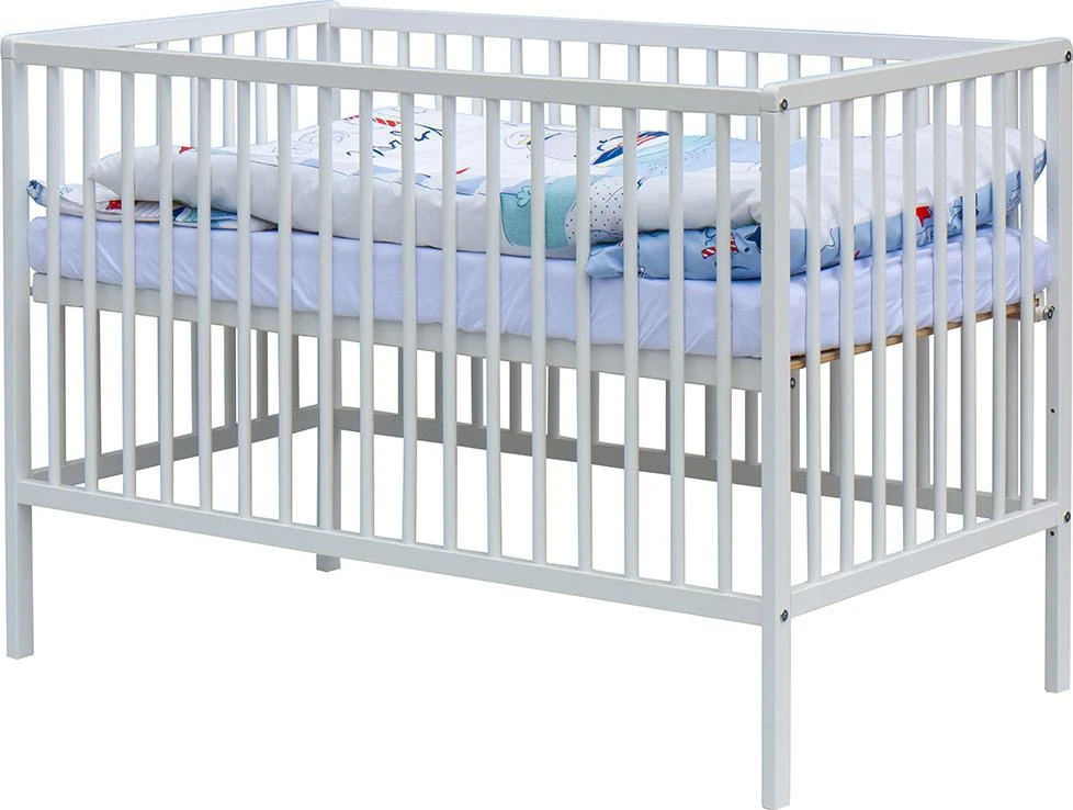 1. Dětská dřevěná postýlka 120x60 cm - bílá, masiv buk, 3 vyndavací příčky, 3 polohy roštu