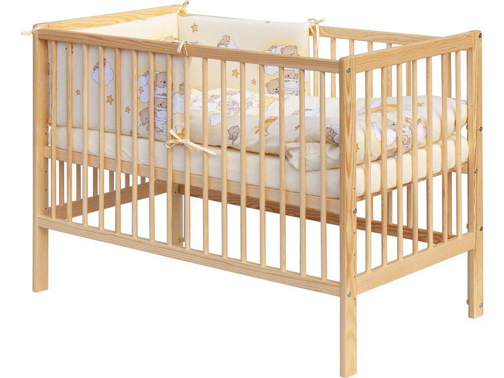 1. Dětská dřevěná postýlka 120 x 60 cm - přírodní, masiv borovice, 3 vyndavací příčky, 6 polohy roštu, nohy postýlky jsou předvrtány pro případné nasazení koleček
