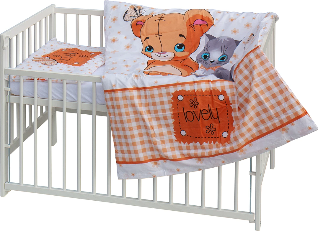 Základem kompletu je dřevěná postýlka o rozměru 120 × 60 cm, vyrobená z masivní borovice v bílé barvě. Postýlka je vybavena stahovacím bokem, který usnadňuje manipulaci s miminkem, a roštem nastavitelným do 6 poloh, díky čemuž se snadno přizpůsobí věku a vývoji dítěte.