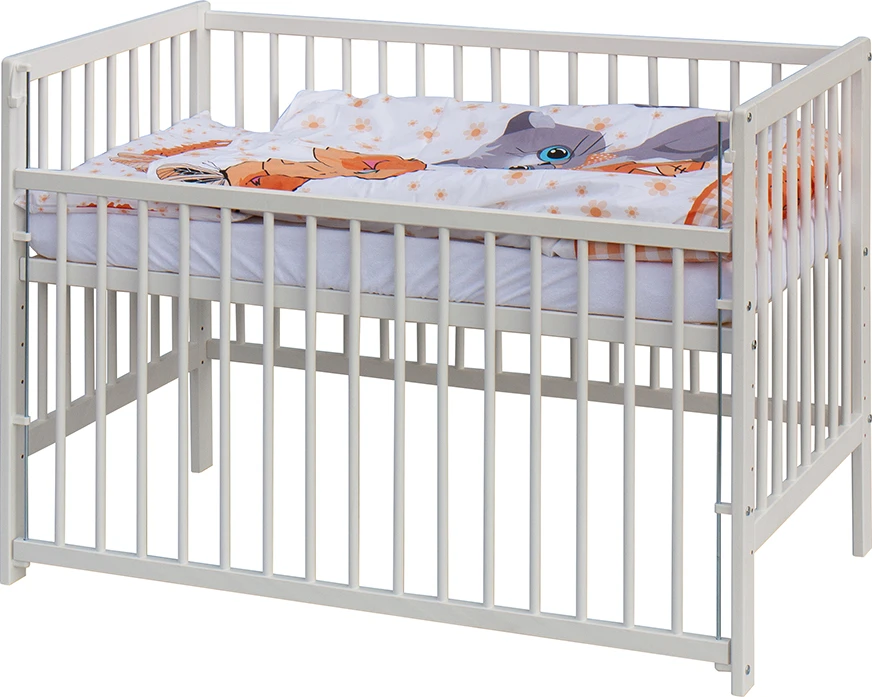 1. Dětská dřevěná postýlka 120 x 60 cm - bílá, masiv borovice, stahovací bok, 6 poloh roštu