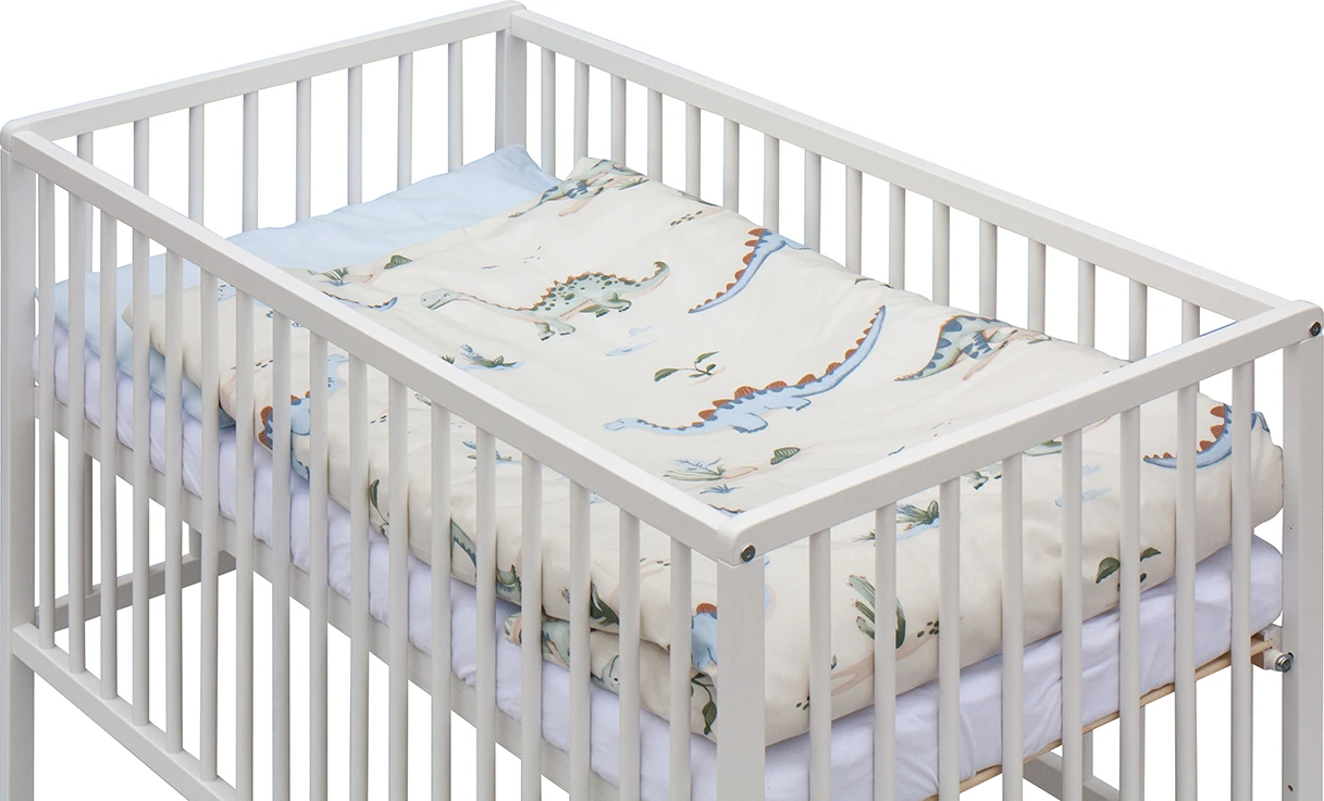 Postýlka disponuje dvěma polohami roštu a třemi vyndavacími příčkami, které usnadňují každodenní manipulaci i přizpůsobení podle růstu dítěte. Součástí kompletu je matrace i kompletní ložní výbava, takže máte vše potřebné přehledně v jednom balení.