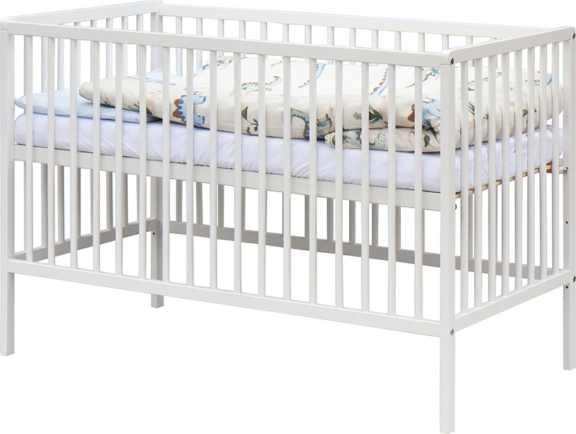 1. Dětská dřevěná postýlka 120 x 60 cm - bílá, masiv buk, 3 vyndavací příčky, 2 polohy roštu,
