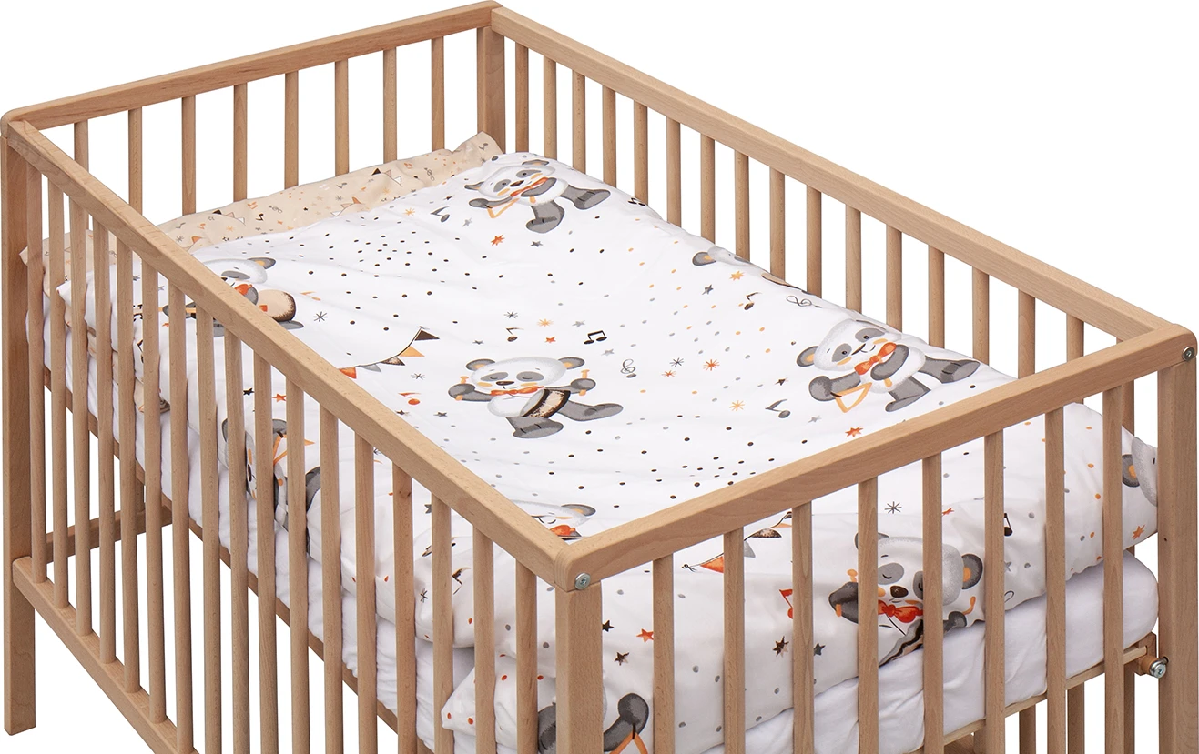 Postýlka disponuje dvěma polohami roštu a třemi vyndavacími příčkami, které usnadňují manipulaci i přizpůsobení podle růstu dítěte. Součástí kompletu je matrace i kompletní ložní výbava, takže máte vše připravené bez starostí.