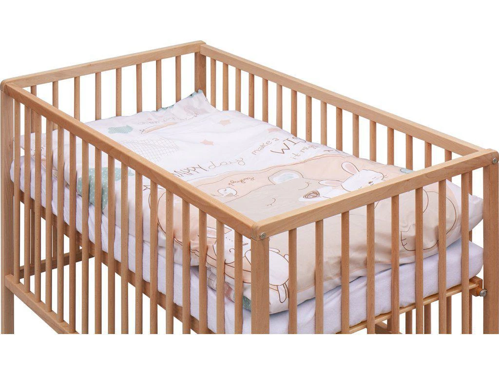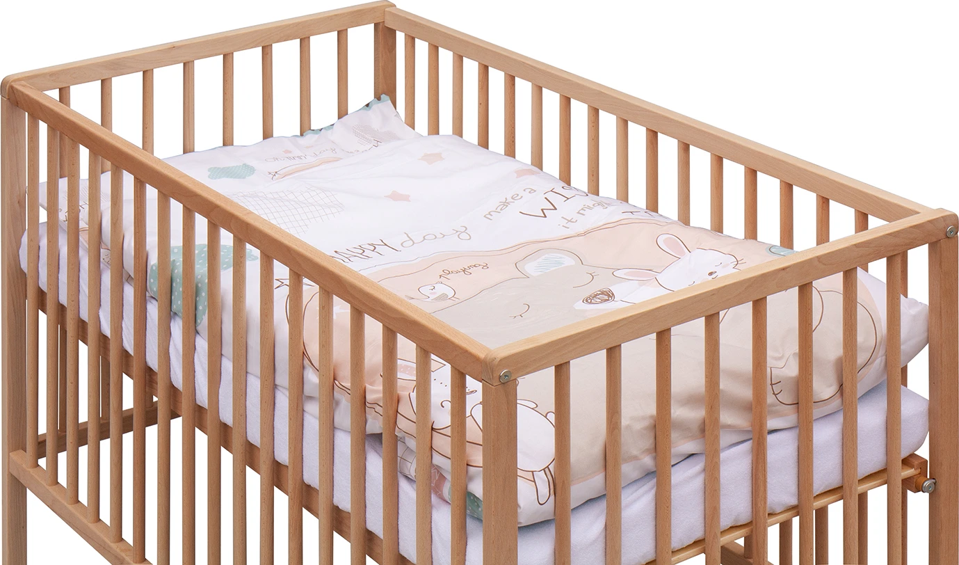 1. Dětská dřevěná postýlka 120 x 60 cm - přírodní, masiv borovice, 3 vyndavací příčky, 3 polohy roštu,