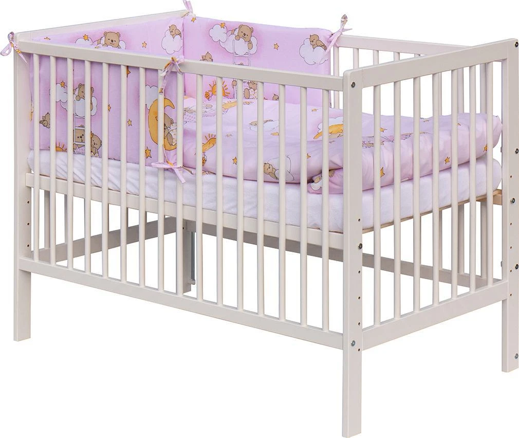 1. Dětská dřevěná postýlka 120x60 cm - bílá, masiv borovice, 3 vyndavací příčky, 5 poloh roštu, nohy jsou předvrtané pro možné nasazení koleček