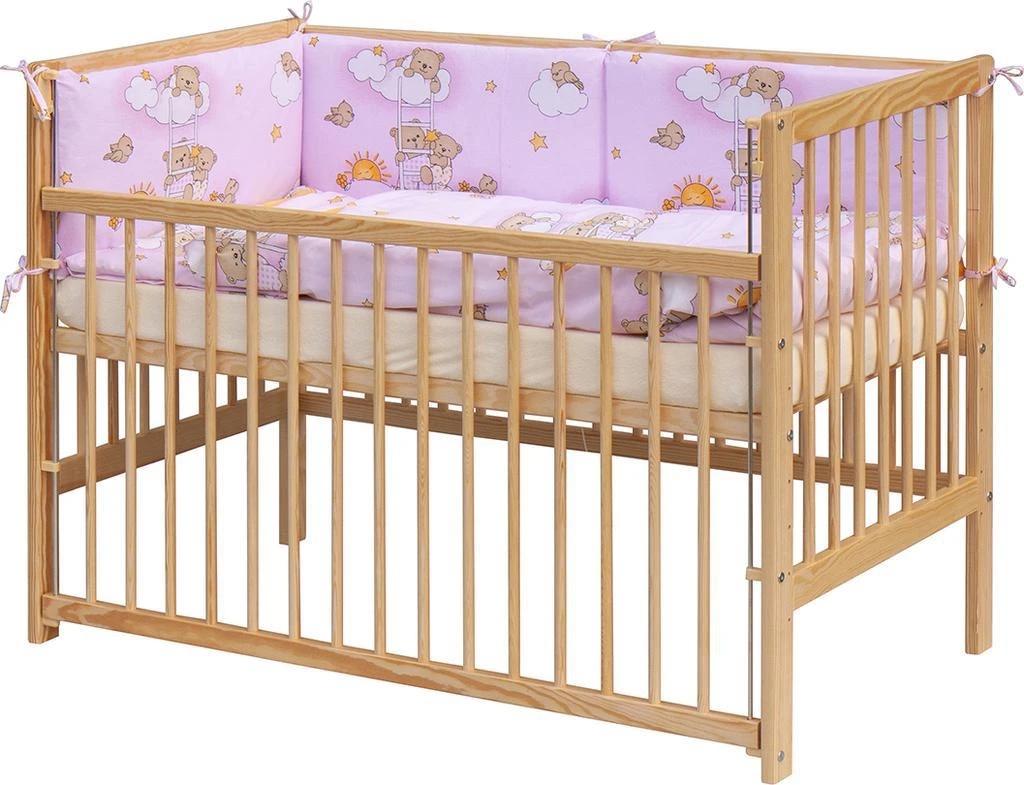 1. Dětská dřevěná postýlka 120 x 60 cm - přírodní, masiv borovice, stahovací bok, 6 poloh roštu