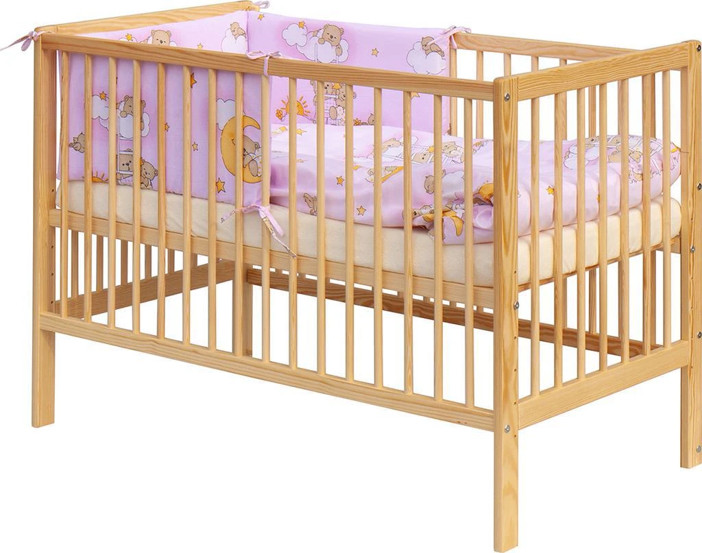 1. Dětská dřevěná postýlka 120 x 60 cm - přírodní, masiv borovice, 3 vyndavací příčky, 6 polohy roštu, nohy postýlky jsou předvrtány pro případné nasazení koleček