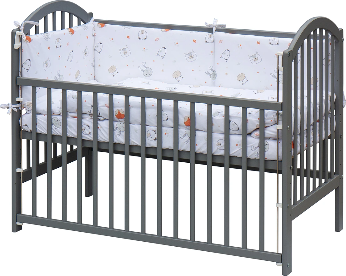 1. Dětská dřevěná postýlka 120 x 60 cm - šedá, masiv borovice, stahovací bok, 6 poloh roštu, nohy postýlky jsou předvrtané pro případné nasazení koleček