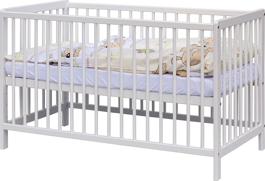 1. Dětská dřevěná postýlka 120x60 cm - bílá, masiv borovice, 3 vyndavací příčky, 5 poloh roštu