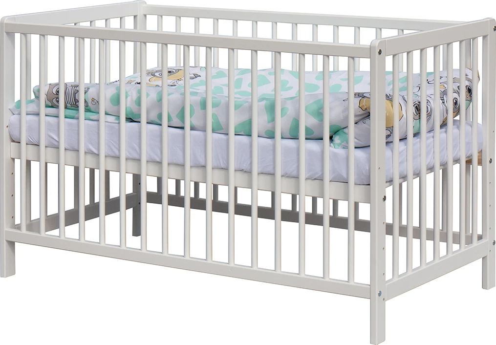 1. Dětská dřevěná postýlka 120x60 cm - bílá, masiv borovice, 3 vyndavací příčky, 5 poloh roštu