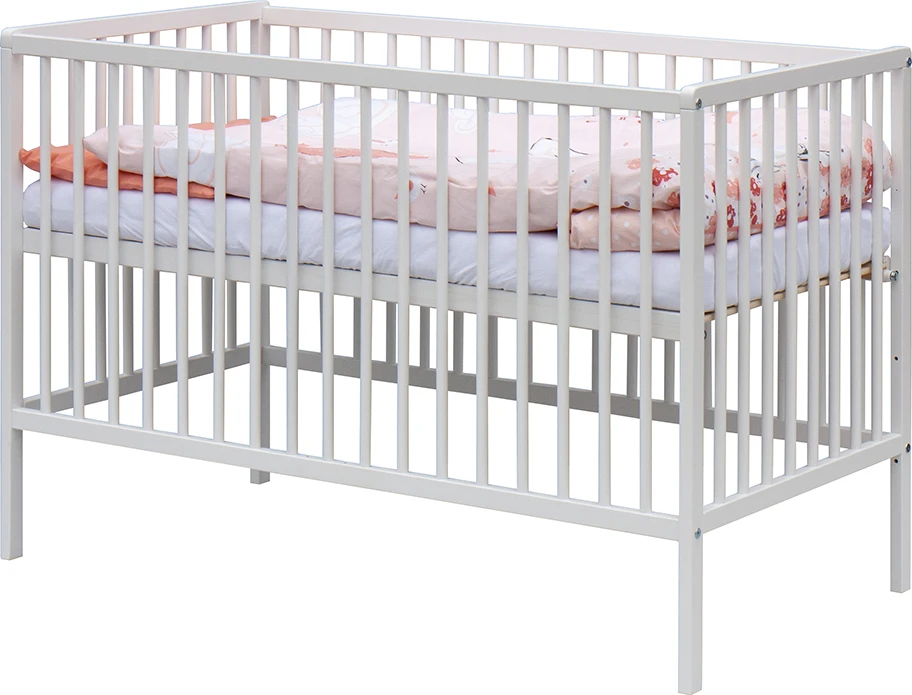 1. Dětská dřevěná postýlka 120 x 60 cm - bílá, masiv buk, 3 vyndavací příčky, 2 polohy roštu,
